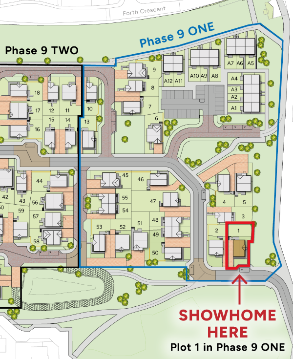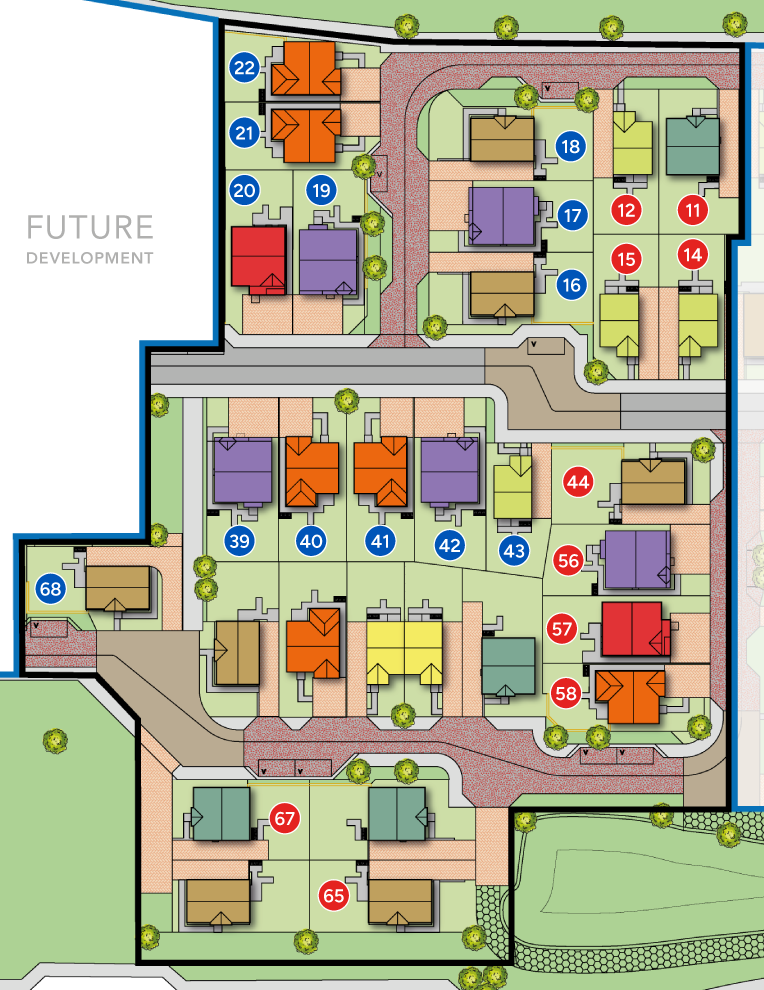 The Development Plan is for orientation purposes only and does not show details of land gradients, boundary treatments or lighting. The plan has been prepared with care, and it is our intention to build in accordance with this plan, but there may be occasions when boundaries, footpaths and landscaping may change during the building process.